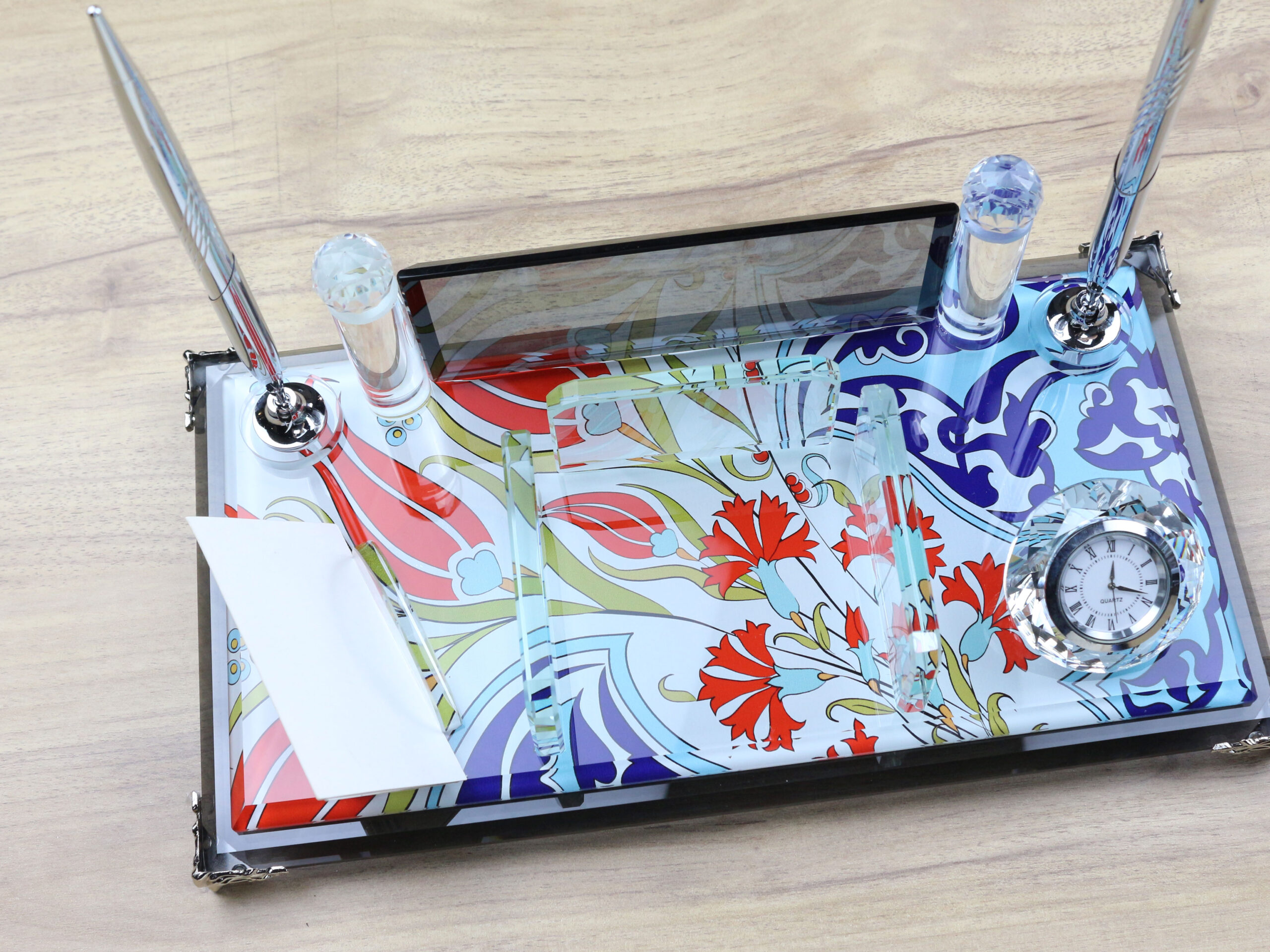 - Boyutları 16 cm x 30 cm metal aksesuarlı kristal cam masa isimliği modeli