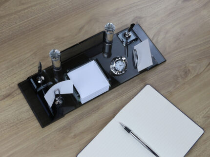 Füme Bloknotlu Kristal Masa İsimliği, ofis alanınıza şıklık ve zarafet katmak için mükemmel bir seçenektir. Yüksek kaliteli kristal malzemeden üretilen bu isimlik, zarif bir gümüş kalem ile birlikte gelir, bu da hem işlevsellik hem de estetik bir görünüm sunar. Üzerinde kişisel adınız ve unvanınız estetik bir şekilde sergilenir, böylece profesyonel imajınızı güçlendirir. Modern tasarımıyla her türlü ofis dekorasyonuna uyum sağlar. Hem işlevsel hem de dekoratif bir aksesuar olarak, çalışma alanınıza anlam ve zarafet katan bu isimlik, aynı zamanda anlam dolu bir hediye alternatifi olarak da öne çıkar.
