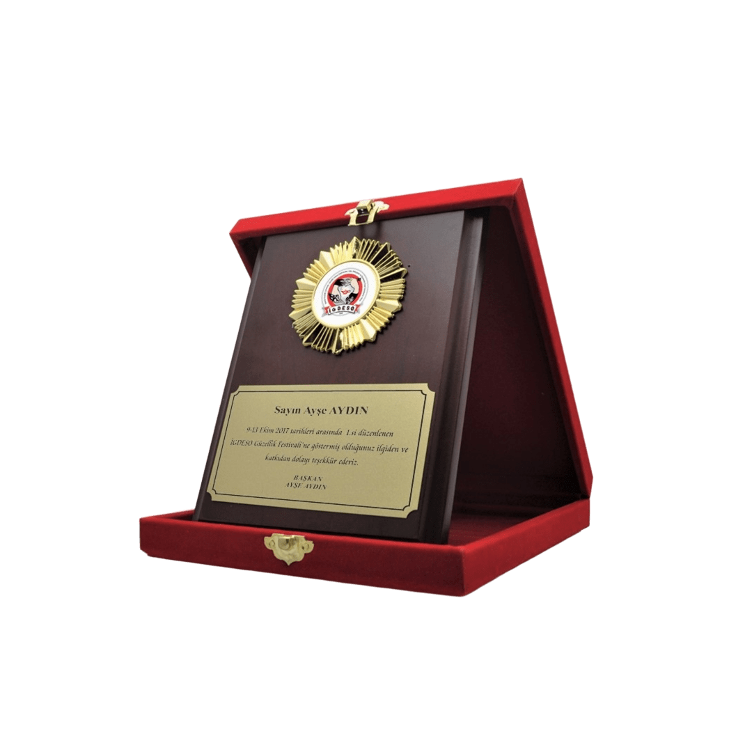 Kadife Kutulu Plaket modelleri, üstün başarıları ve önemli katkıları onurlandırmak için sunulan prestijli ödüllerdir. Bu özel plakalar, kurumsal ya da bireysel etkinliklerde, kişiye özel tasarımlarla hazırlanarak değerli birer hatıra haline gelir. Kadife kutulu plaketler, minnettarlığın, takdirin ve başarıların simgesi olarak uzun yıllar saklanabilecek mükemmel bir seçenektir. Çalışanlarınızı, öğrencilerinizi veya ödül verilecek kişileri, üzerlerine anlamlı mesajlar ekleyerek eşsiz bir hediye ile ödüllendirebilirsiniz.