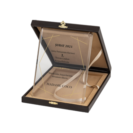 Deri Kutulu Kristal Şeffaf Satış Danışmanı Plaketi Deri Kutulu Kristal Şeffaf Satış Danışmanı Plaketleri, şık tasarımı ve zarif detaylarıyla özel anlarınızı